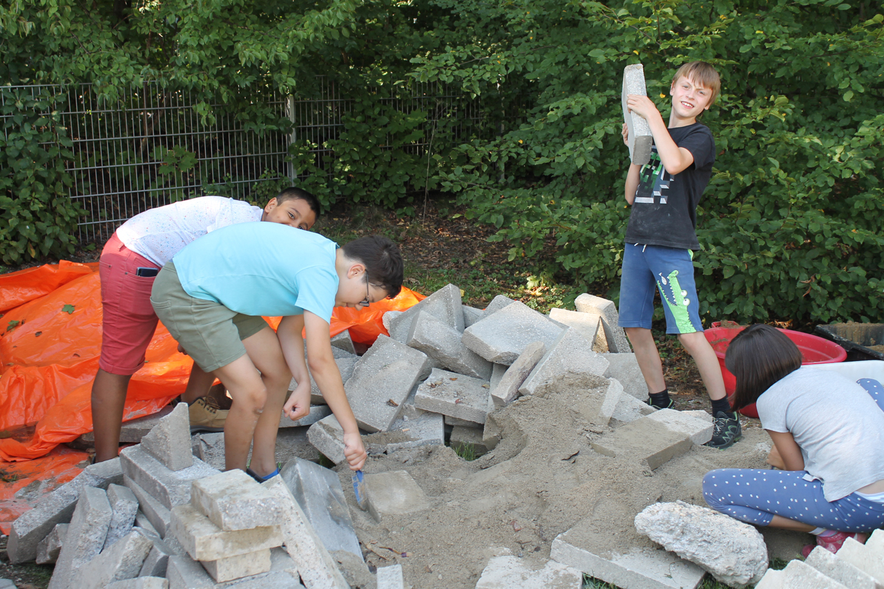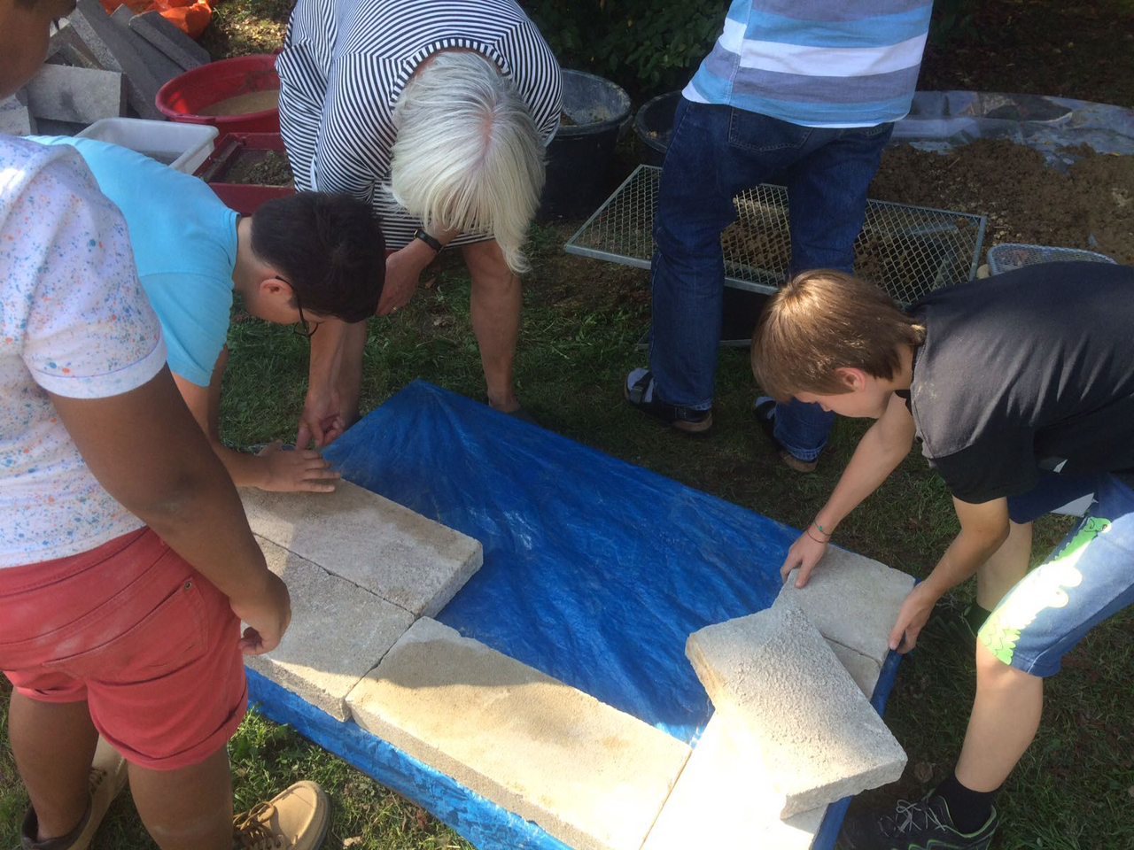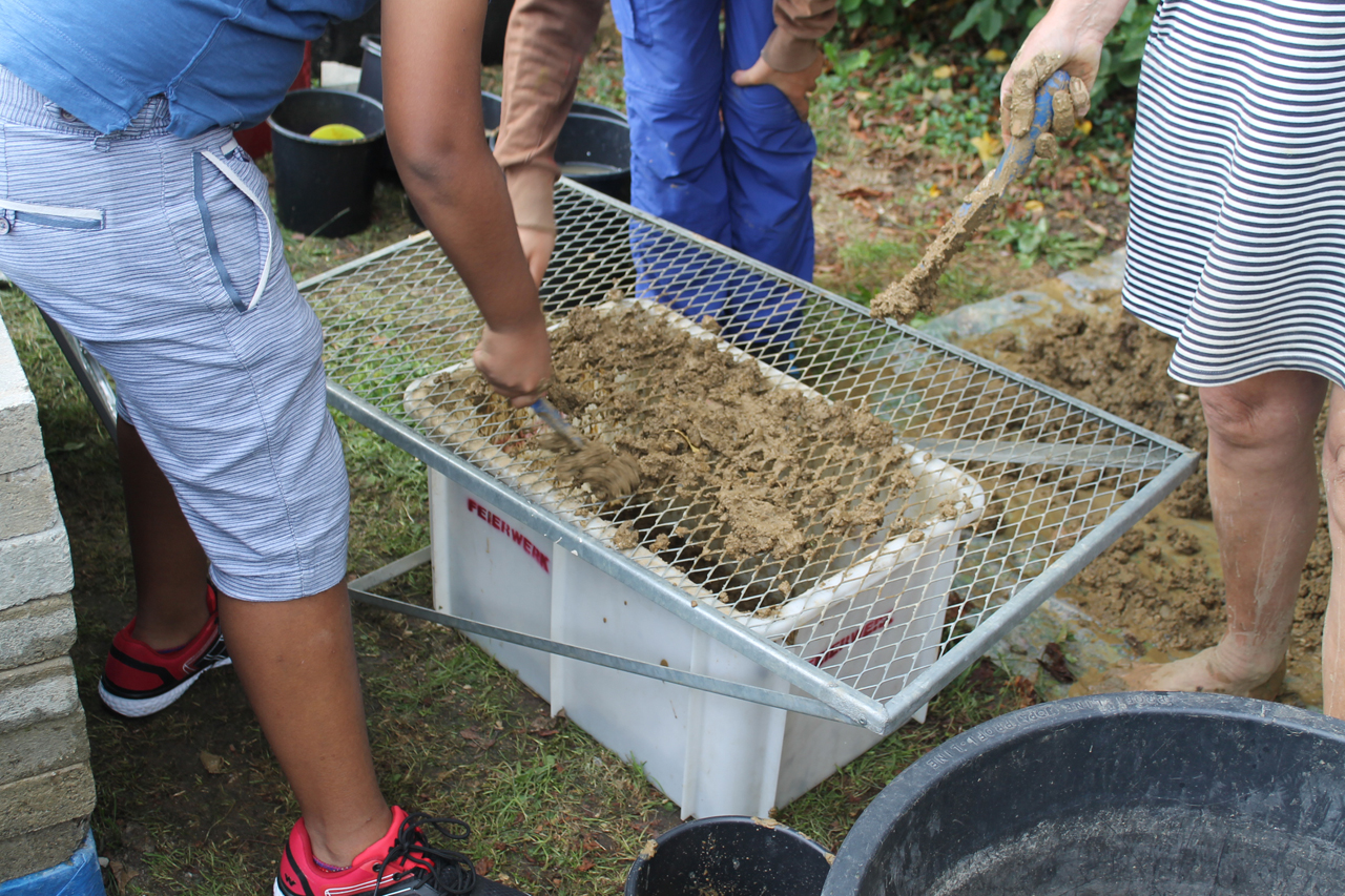 Am 6.9. fingen wir an, den Sockel zu bauen. Viele Kinder waren direkt dabei, aber es war eine ganz schön harte Arbeit: Wir stapelten schwere Steinplatten auf eine Palette, um eine stabile Grundlage für den Ofen zu haben. Welcher Stein passt auf welchen und wie legen wir sie genau hin? Parallel mussten wir den Lehm von allen kleinen Steinchen befreien, also siebten wir den ganzen Lehm durch große Kompostsiebe. Das hat ganz schön lange gedauert. Vor allem, weil wir wollten, dass möglichst alle Steinchen rausgesiebt sind, weil man sich beim Kneten und Stampfen mit den Händen und Füßen ja auf keinen Fall weh tun sollte.