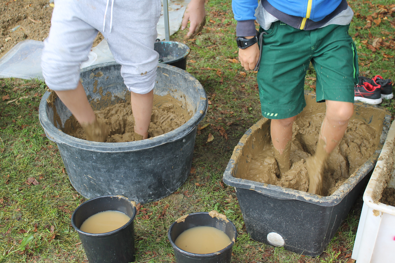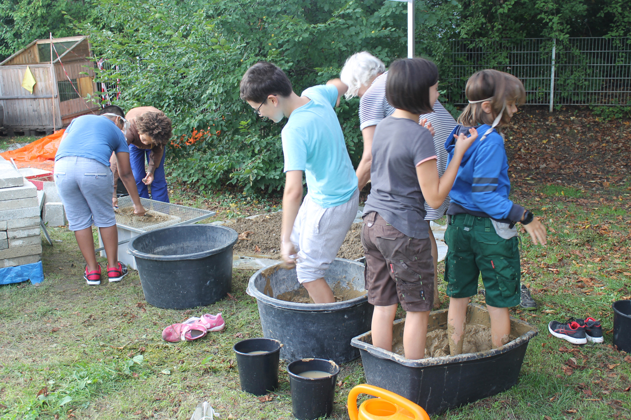 Anschließend vermischten wir ihn mit Sand. Das Stampfen selber hat allen sehr viel Spaß gemacht, obwohl sich doch ganz schön viele kleine Steinchen sehr gut versteckten. Es war jeden Tag eine ganz schöne Schweinerei, die allen immer wieder Freude bereitet hat. Zum Glück geht Lehm wieder überall gut raus.