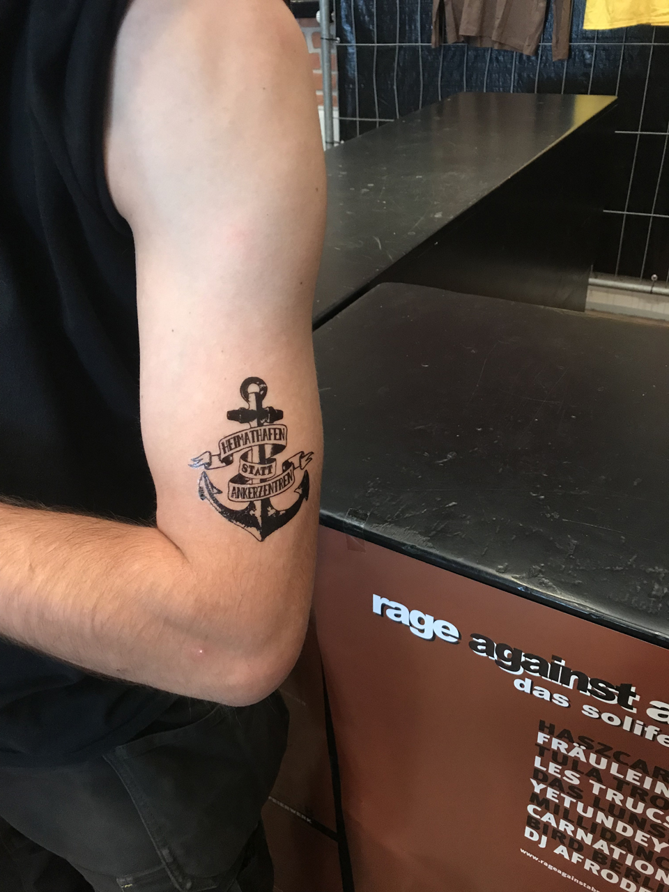 „Wir haben dieses Jahr vor dem Eingang eine ‚Messe der agressiven Anti-Abschiebeindustrie‚ aufgebaut“, erzählt Agnes vom BFR. „Acht Gruppen haben mitgemacht und in den Pavillons unterschiedliche Aktionen angeboten, das war richtig toll!“ Idee dieser Messe war es, den Besucher*innen des Festivals zu all den komplexen Themen rund um Abschiebung und die Politik der Abschottung einen interaktiven Zugang zu ermöglichen. „Und das hat wirklich gut funktioniert: Bei mixmuc konnte man Brücken bauen, bei Alarmphone Notrufe absetzen und vieles mehr“, berichtet Agnes weiter. Pro Aktion gab es einen Stempel und sobald die Besucher*innen alle acht Stationen durchlaufen hatten, konnten sie sich drinnen beim Stand des Flüchtlingsrats ein Zertifikat abholen. Dort gab es auch ein cooles Tattoo mit einem Anker, und der Anker selbst war sogar als menschliches Maskottchen auf dem Festival-Gelände unterwegs.