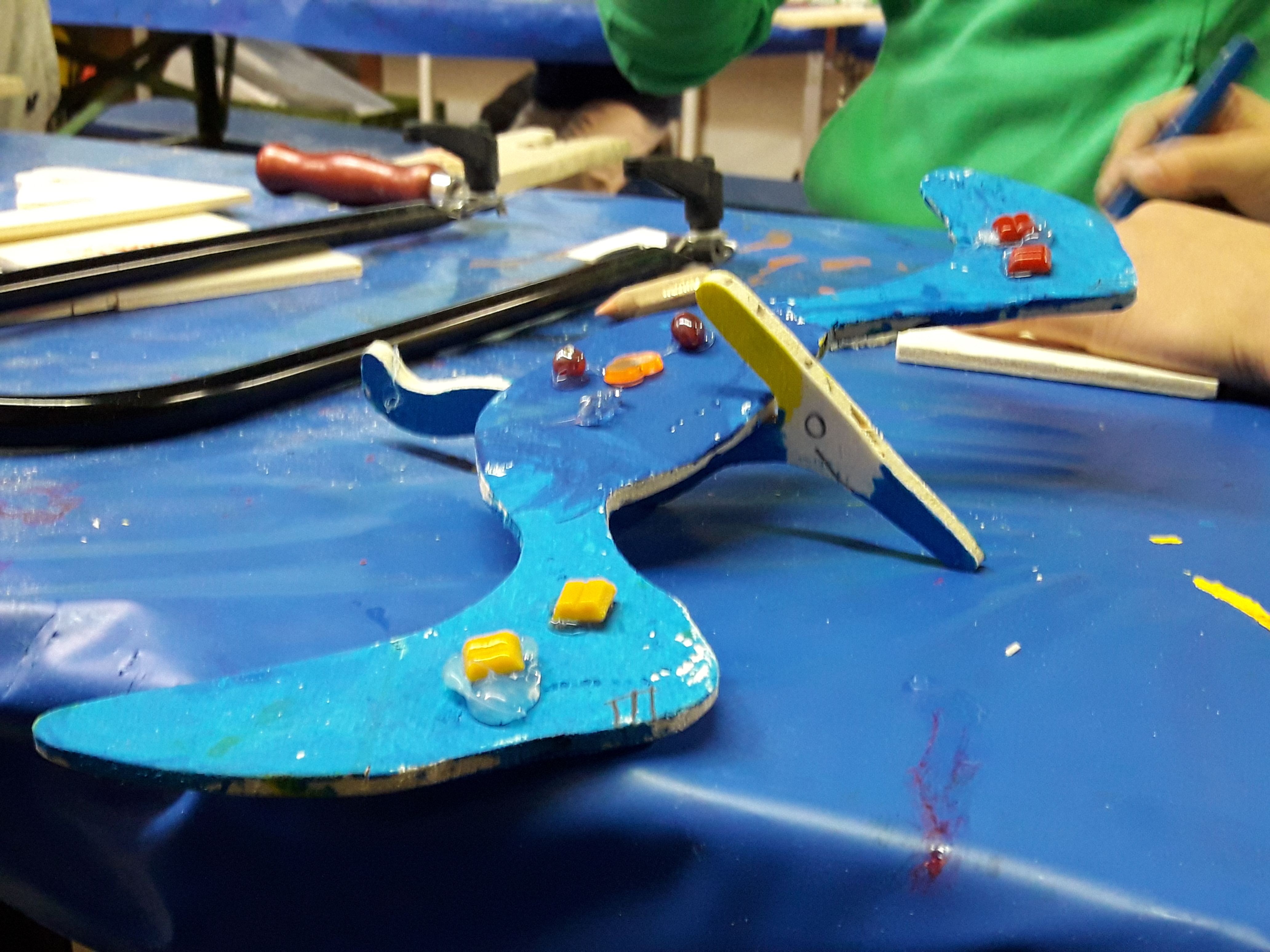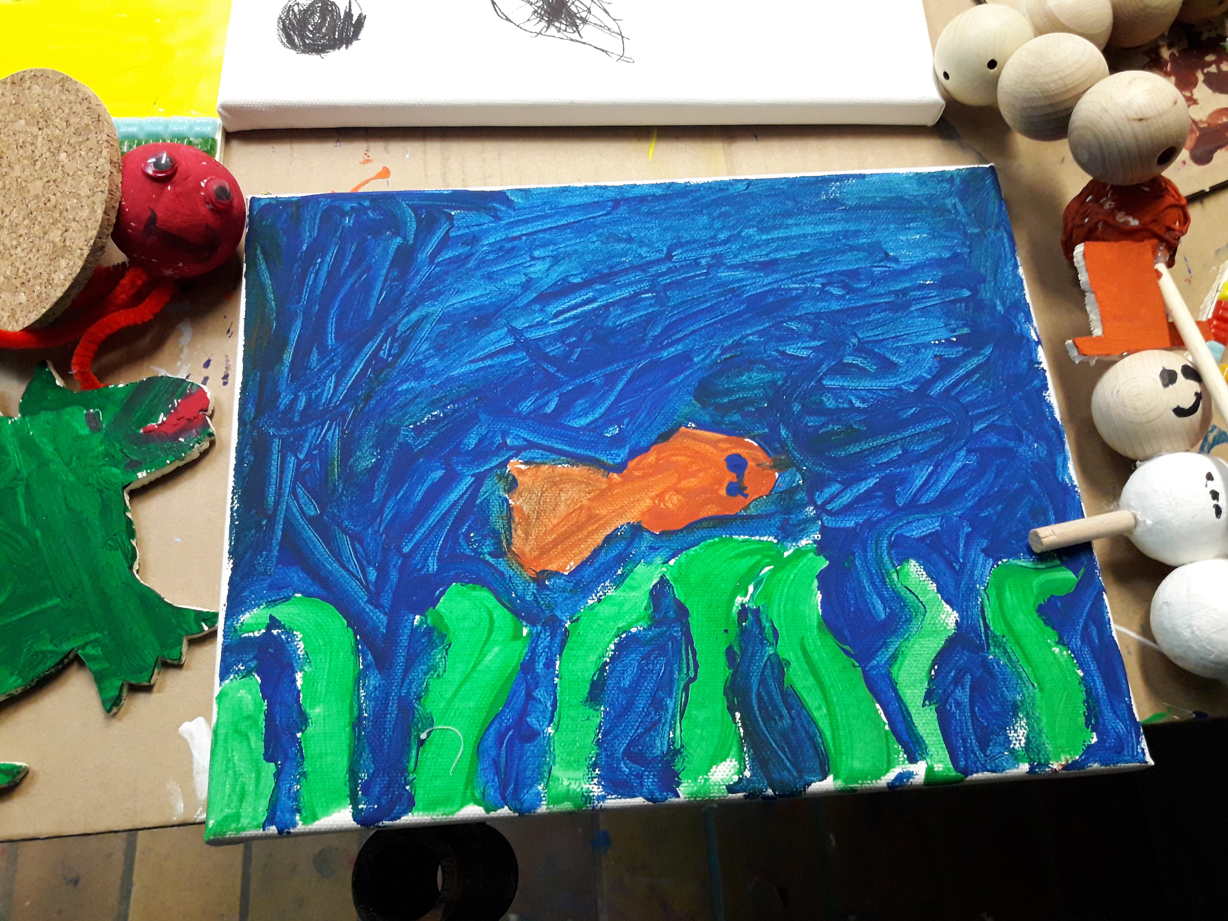 Max war besonders vom Tigerhai fasziniert, den ich für ihn fotografieren musste, damit er ihn in unserer Werkstatt nachbauen konnte. Auch die quirligen kleinen Seepferdchen, gefährlich blickenden Haie und die Quallen sorgen bei den Kindern für große Augen. Am Ende unseres Besuchs wurde jedem Kind eine goldene Medaille überreicht, die sie zu Meeres-Expert*innen ernannte. Stolz machten wir uns damit auf den Rückweg in den Dschungelpalast. In unserer Werkstatt entstanden dann aus Holz, Leinwänden und Farben Kunstwerke, bei denen die Kinder ihre gesammelten Eindrücke verarbeiten konnten.