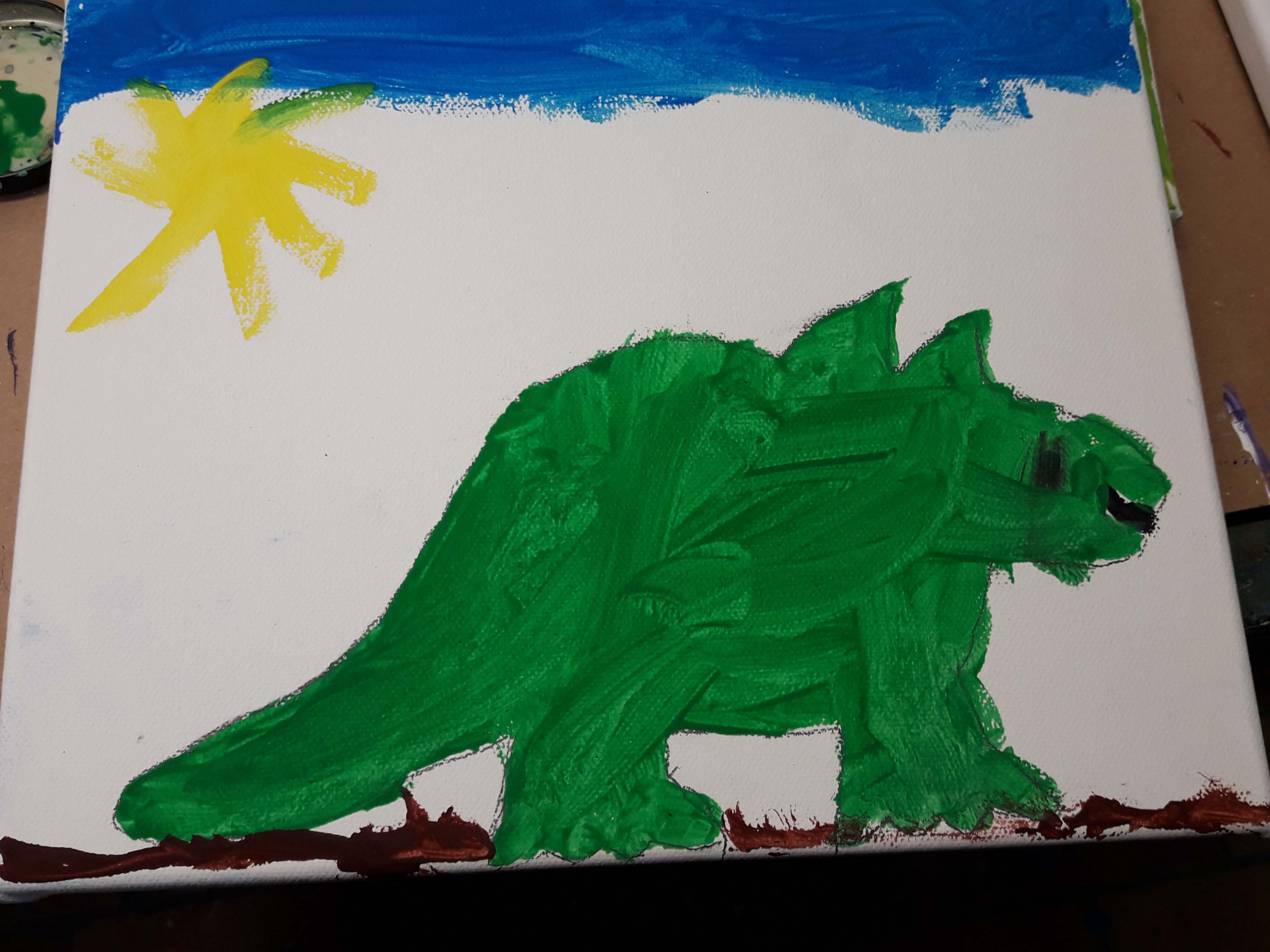 Zum Abschluss suchten wir den Steinboden des Geologischen Museums nach Einschlüssen und Fossilien ab, die im glänzenden Stein zu finden waren. Unsere kleinen Forscher entdeckten jedes auch noch so kleine Fossil. Mit den gesammelten Eindrücken verbrachten wir den Nachmittag in unserer Werkstatt. Es entstanden kleine Dinosaurier aus Holz und kunterbunte Bilder auf Leinwand.