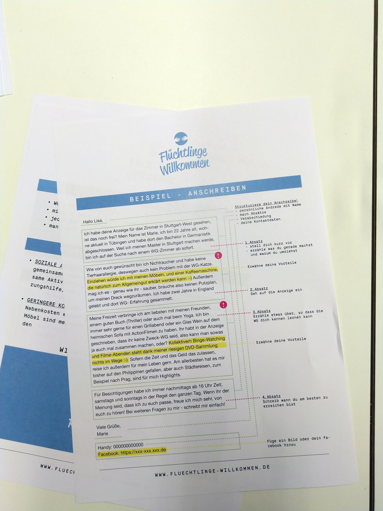 Zusätzlich bekommen die beiden Männer noch ein Handout, in dem sie ein Musteranschreiben und weitere hilfreiche Infos finden. Vieles von dem, was hier erklärt wird, wissen Sheriff und Amar schon. Sie sprechen sehr gut Deutsch und haben bereits Erfahrungen bei der Wohnungssuche. Oft ist es aber auch anders, dann sprechen die Teilnehmer*innen nur gebrochen Deutsch und die Verständigung gestaltet sich schwierig. Irgendwie klappt es aber immer.